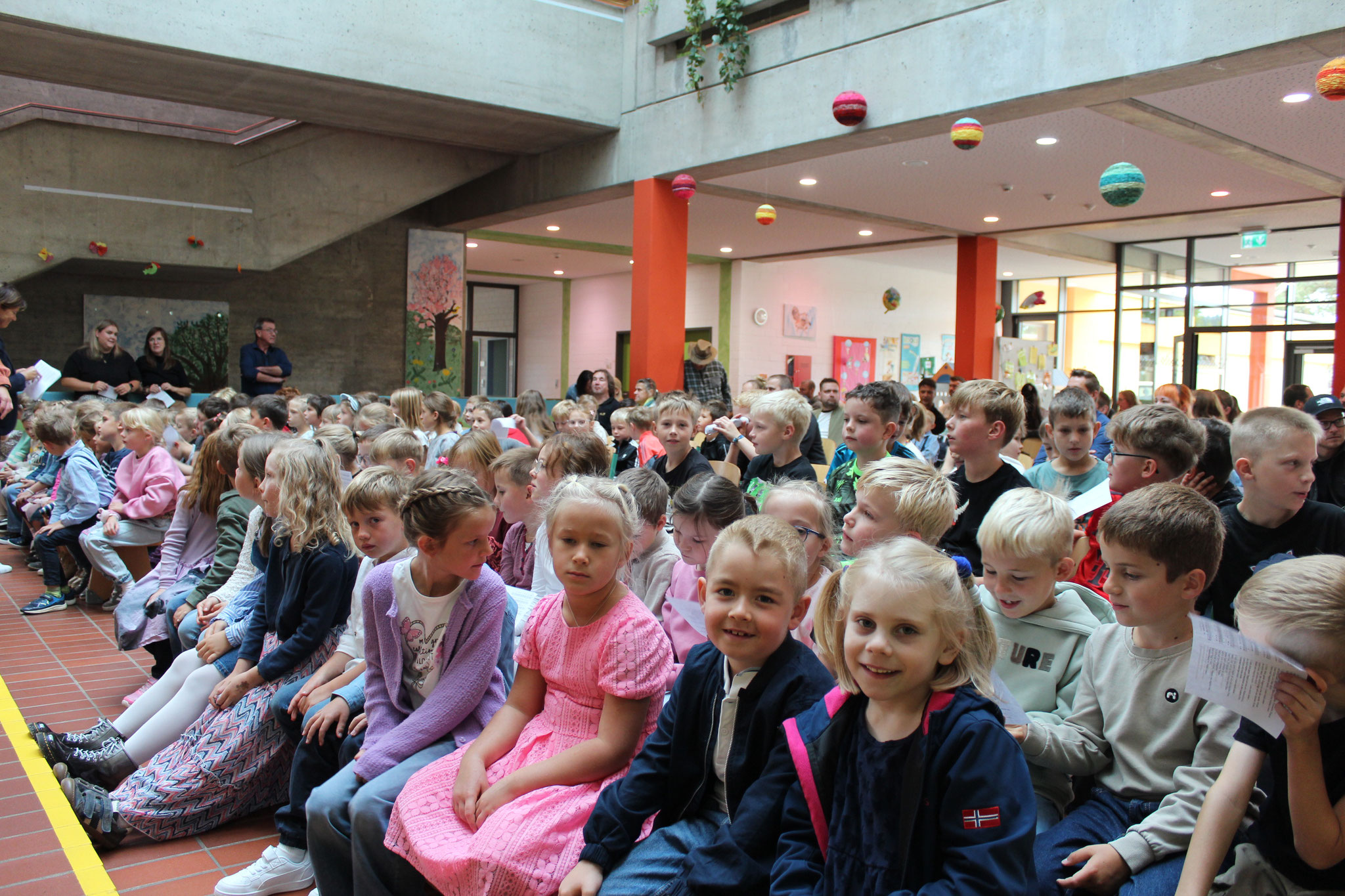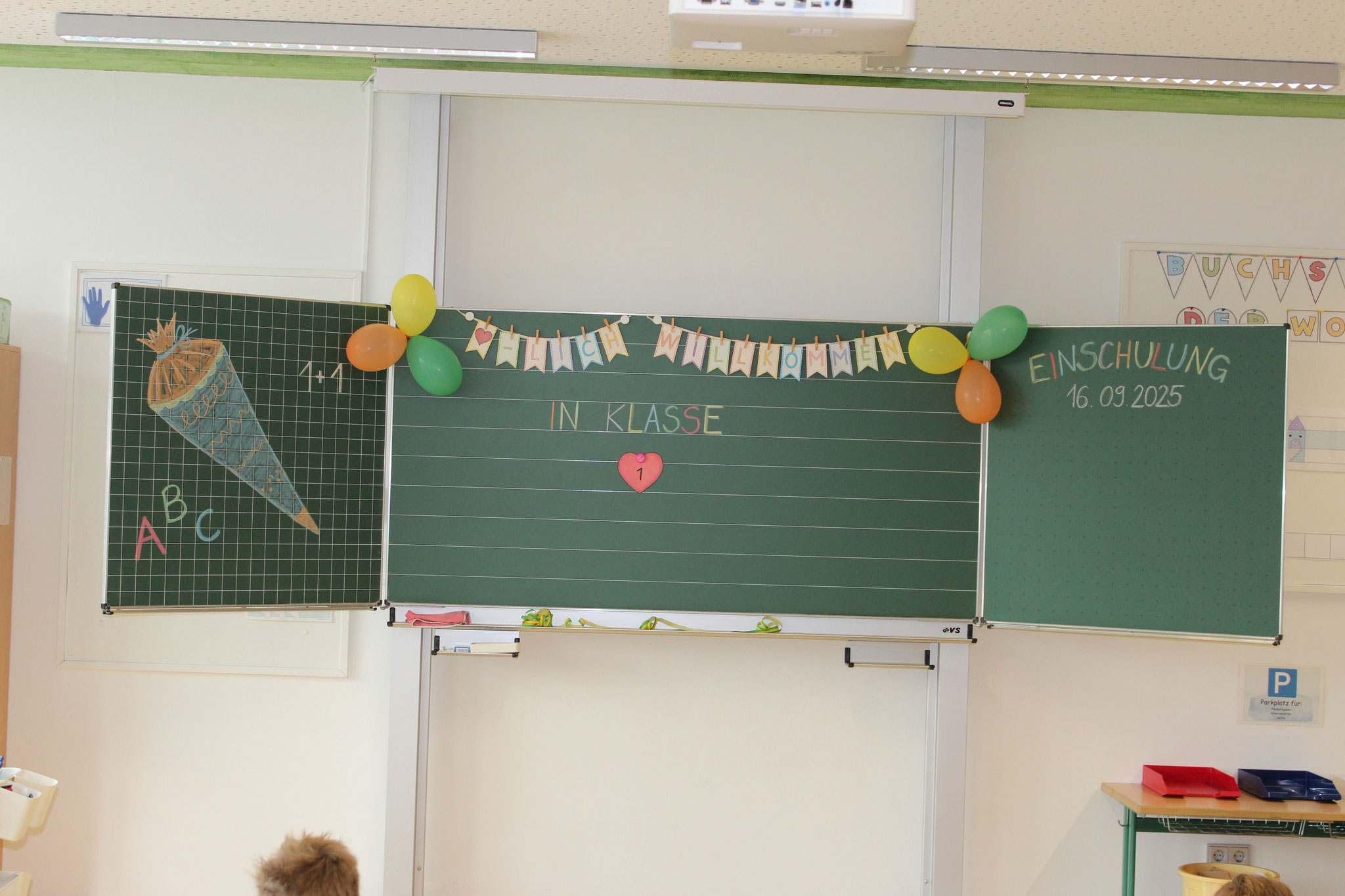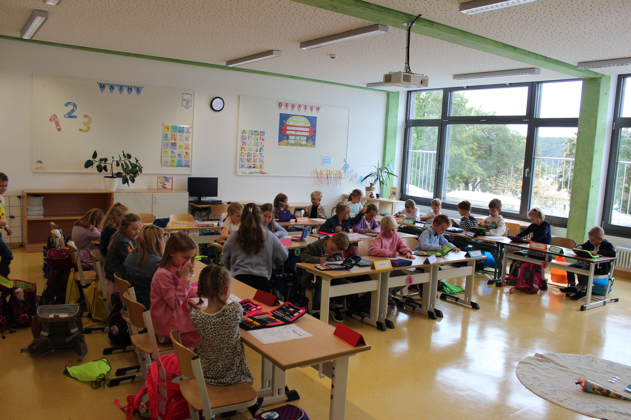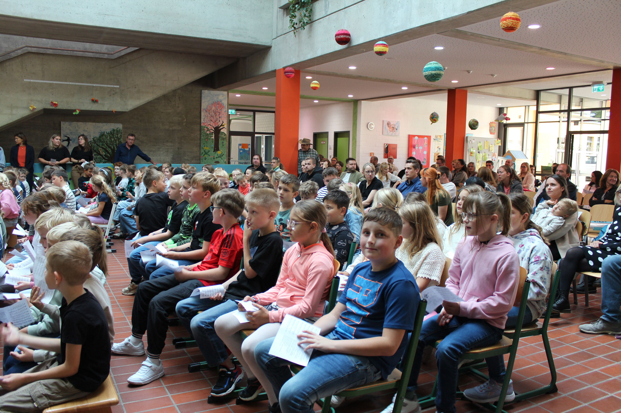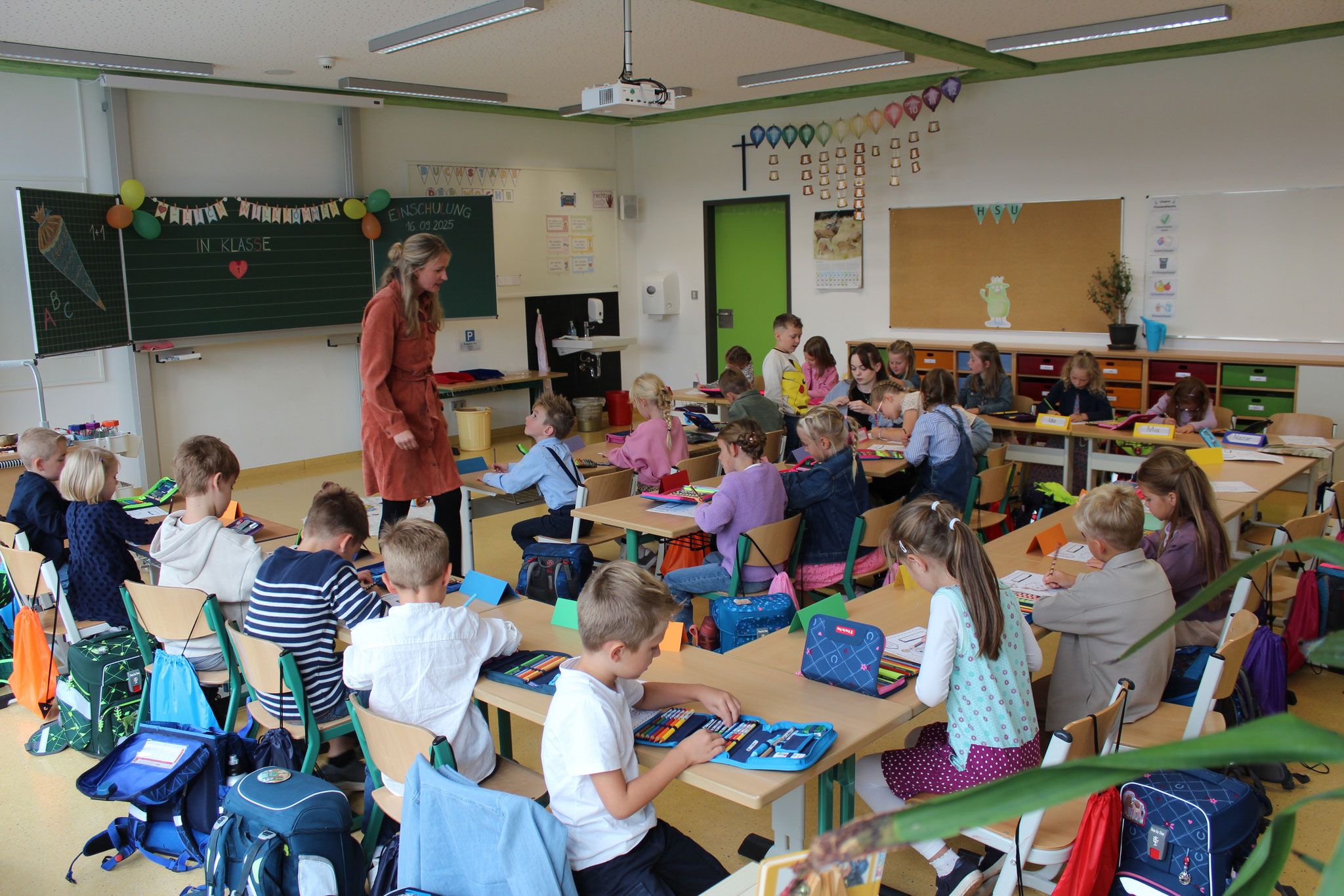 Am Dienstag fand die Einschulungsfeier für unsere neuen Erstklässler statt. Insgesamt wurden 26 Kinder, darunter 17 Mädchen und 9 Jungen, feierlich an unserer Schule begrüßt. Kinder und Eltern wurden durch unseren Schulleiter sowie mit einem Einschulungsrap der Klasse 3b und einem Gedicht der Zweitklässler empfangen. Nach dem Empfang ging es für die Erstklässler gemeinsam mit ihrer Klassenlehrerin Evelyn Schirmer und der Lehramtsanwärterin Louisa Kori-Lindner das erste Mal ins Klassenzimmer. In einer kurzen Unterrichtsstunde lernten sie ihre neue Umgebung und ihre Mitschülerinnen und Mitschüler kennen.