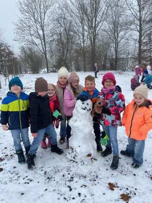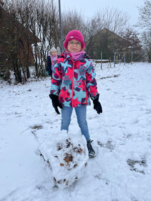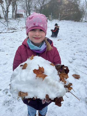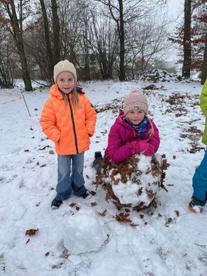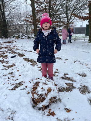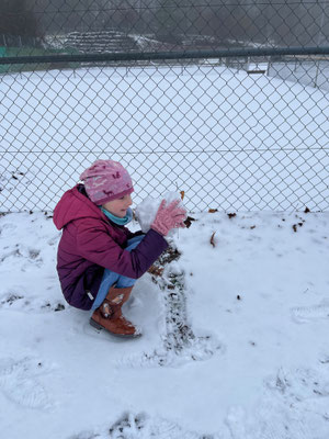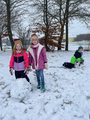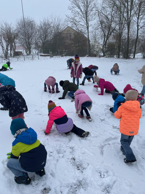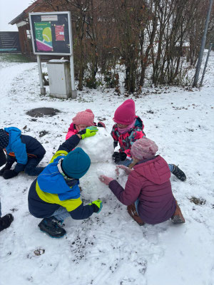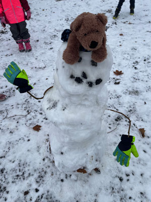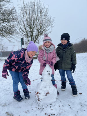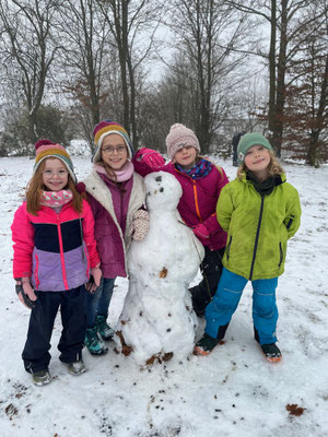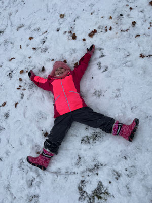 Während des Spaziergangs erkundeten die Kinder begeistert den knirschenden Schnee, entdeckten Tierspuren und nutzten jede Pause, um kreativ zu werden. Mit viel Eifer bauten sie Schneemänner, formten Schneebälle und legten sich lachend in den Schnee, um Schneengel zu machen.